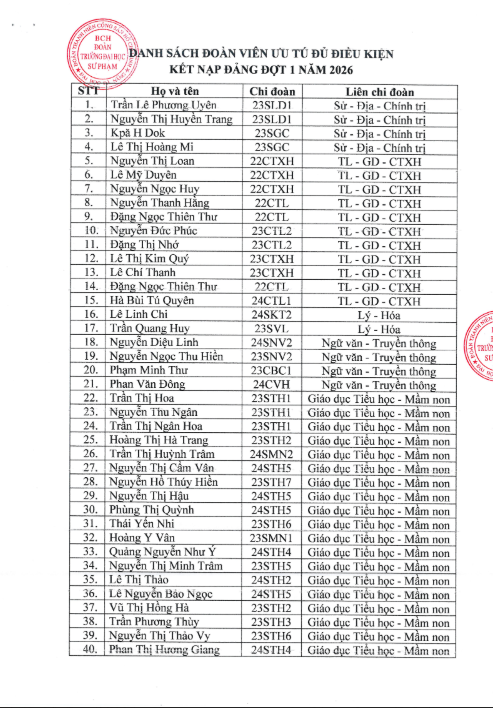 ĐOÀN THANH NIÊN[CÔNG VĂN] Vv gửi danh sách đoàn viên ưu tú điều kiện kết nạp Đảng từ chi đoàn đợt 1 năm 2026 Đã đăng trên 28 Tháng 4, 202628 Tháng 4, 2026 bởi uedbandoanvu Văn bản đầy đủ: TẠI ĐÂY uedbandoanvu [THÔNG BÁO] Về việc triệu tập sinh viên tham dự giao lưu với tác giả tiểu thuyết “Lớp học cuối cùng” – Hoàng Anh Đức và trao đổi chủ đề: Chủ thể người học, quyền lực tri thức và những câu hỏi thời đại AI [KẾ HOẠCH] Vv tổ chức ngày hội Văn hóa đọc năm 2026