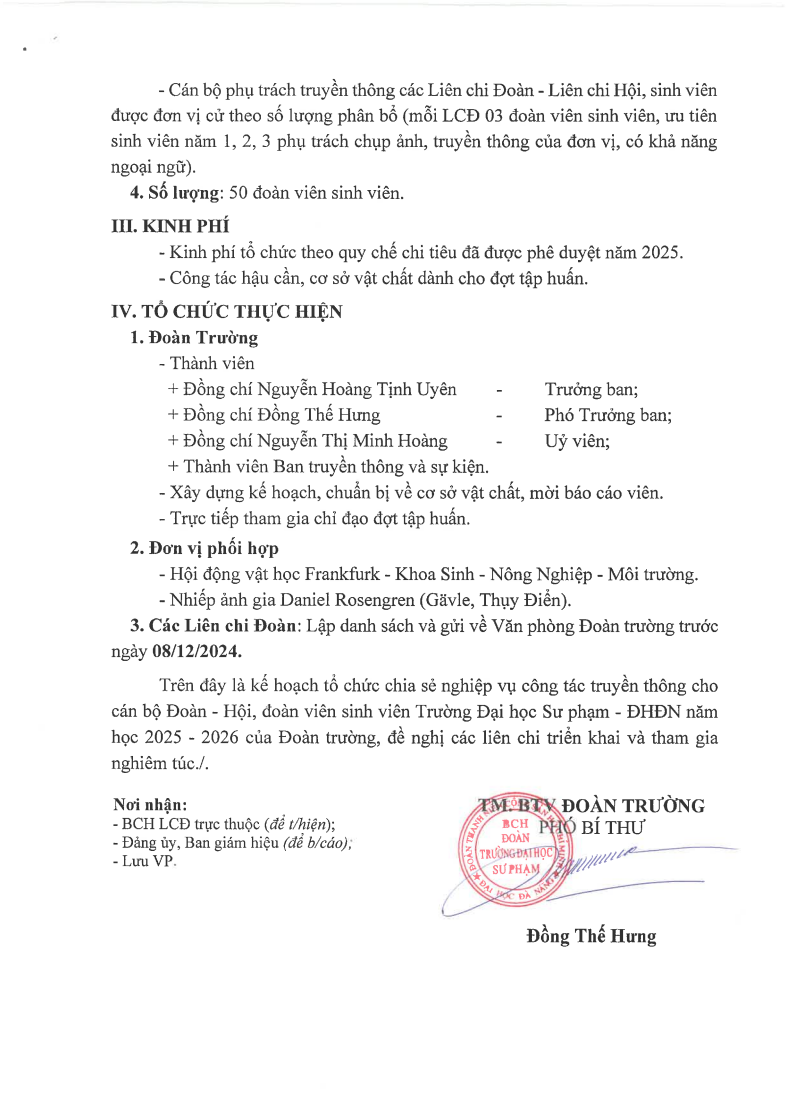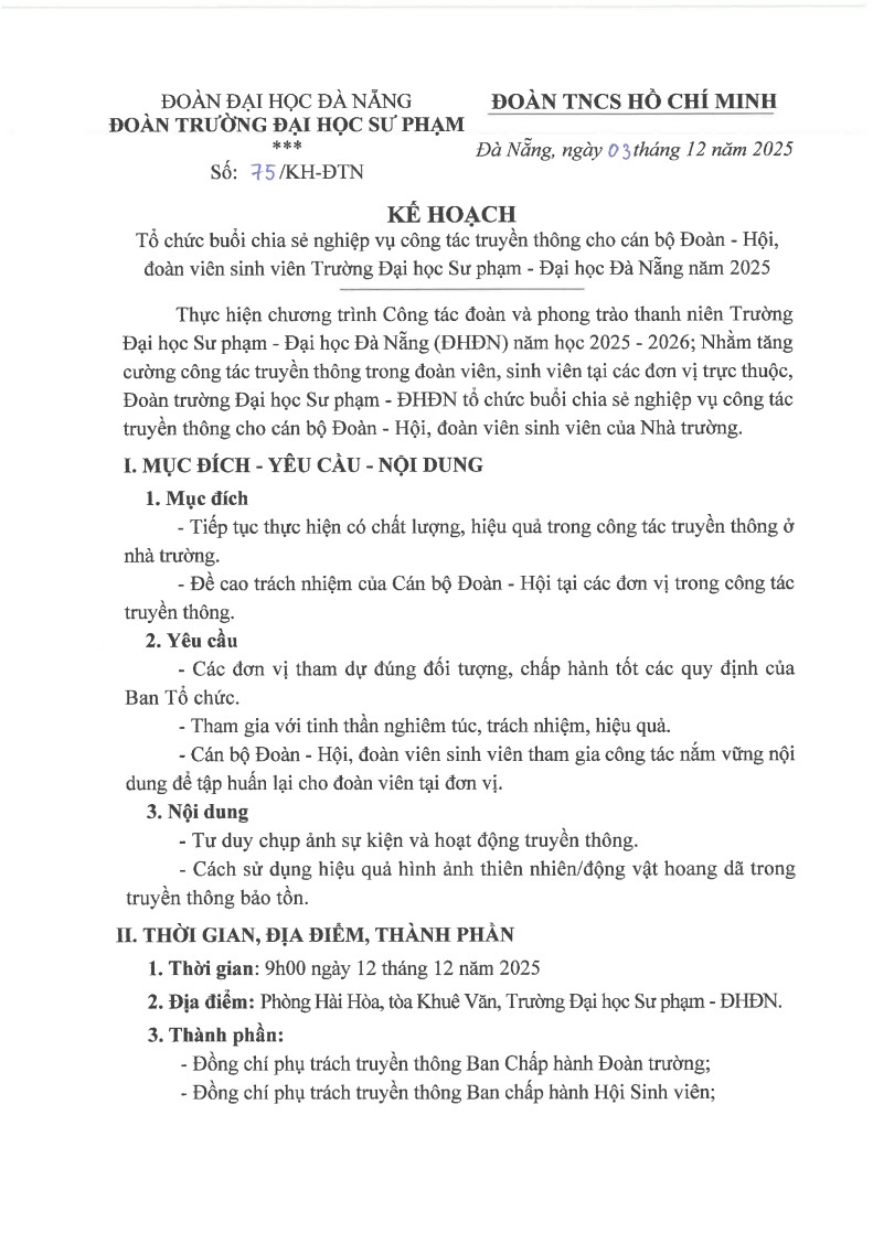 Kế hoạch, ĐOÀN THANH NIÊN[KẾ HOẠCH] Tổ chức buổi chia sẻ nghiệp vụ công tác truyền thông cho cán bộ Đoàn – Hội, đoàn viên sinh viên Trường Đại học Sư phạm – Đại học Đà Nẵng năm 2025 Đã đăng trên 4 Tháng 12, 2025 bởi uedbandoanvu Văn bản đầy đủ: TẠI ĐÂY uedbandoanvu ĐOÀN TRƯỜNG ĐẠI HỌC SƯ PHẠM – ĐHĐN TỔ CHỨC CUỘC HỌP BAN CHẤP HÀNH MỞ RỘNG NĂM 2025