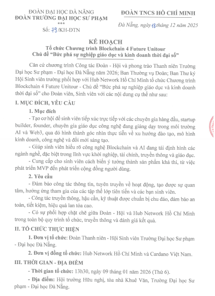 HỆ THỐNG VĂN BẢN, ĐOÀN THANH NIÊN, Kế hoạch[KẾ HOẠCH] Tổ chức Chương trình Blockchain 4 Future Unitor Chủ đề “Bức phá sự nghiệp giáo dục và kinh doanh thời đại số” Đã đăng trên 28 Tháng 12, 2025 bởi uedbandoanvu VĂN BẢN ĐẦY ĐỦ: TẠI ĐÂY uedbandoanvu [KẾ HOẠCH] Tổ chức tập huấn công tác AI – Truyền thông cho cán bộ Đoàn – Hội, đoàn viên, sinh viên trường Đại học Sư phạm – ĐHĐN năm 2025 Lớp học mini “Kỹ năng số 4.0” 🌐 KHÔNG GIAN MẠNG – AN TOÀN HAY RỦI RO, PHỤ THUỘC VÀO CÁCH CHÚNG TA SỬ DỤNG