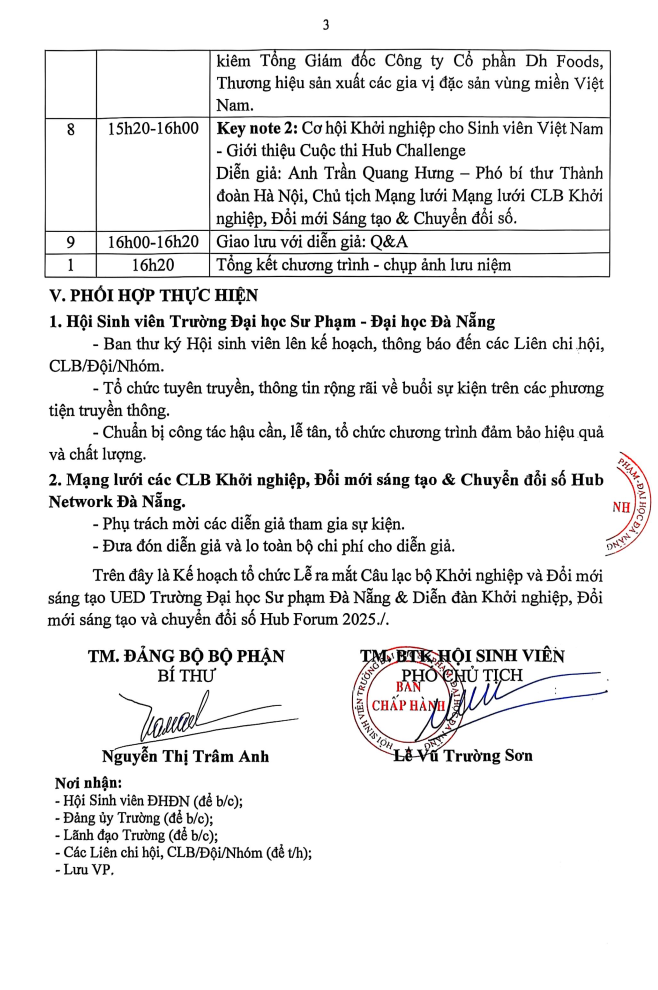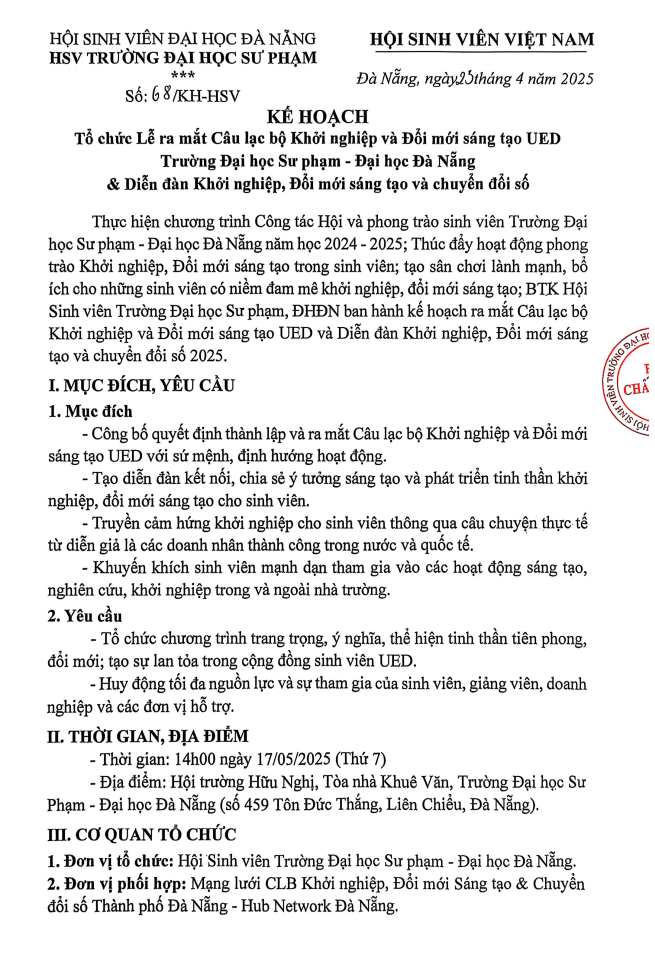 HỘI SINH VIÊN, Kế hoạch[KẾ HOẠCH] Tổ chức Lễ ra mắt Câu lạc bộ Khởi nghiệp và Đổi mới sáng tạo UED Trường Đại học Sư phạm – Đại học Đà Nẵng & Diễn đàn Khởi nghiệp, Đổi mới sáng tạo và chuyển đổi số Đã đăng trên 30 Tháng 10, 2025 bởi uedbandoanvu Văn bản đầy đủ: TẠI ĐÂY uedbandoanvu [KẾ HOẠCH] Tổ chức chương trình giao lưu sinh viên quốc tế & Chào mừng Tết Cổ truyền Bunpimay của Lào [KẾ HOẠCH] Ngày hội “Sinh viên khỏe 2025”