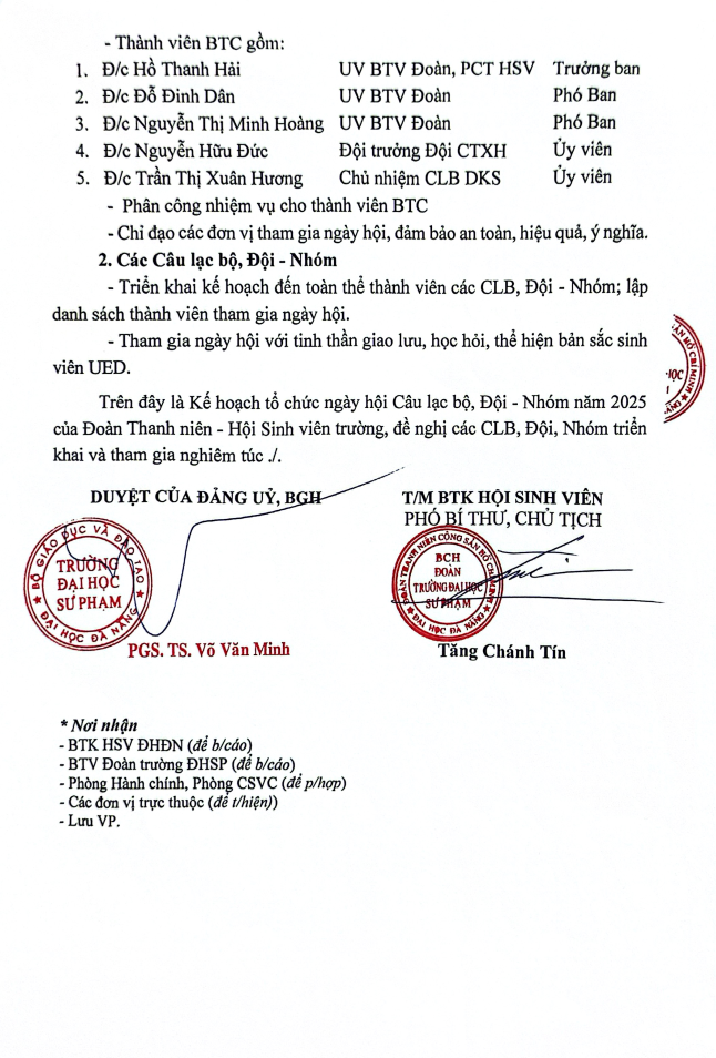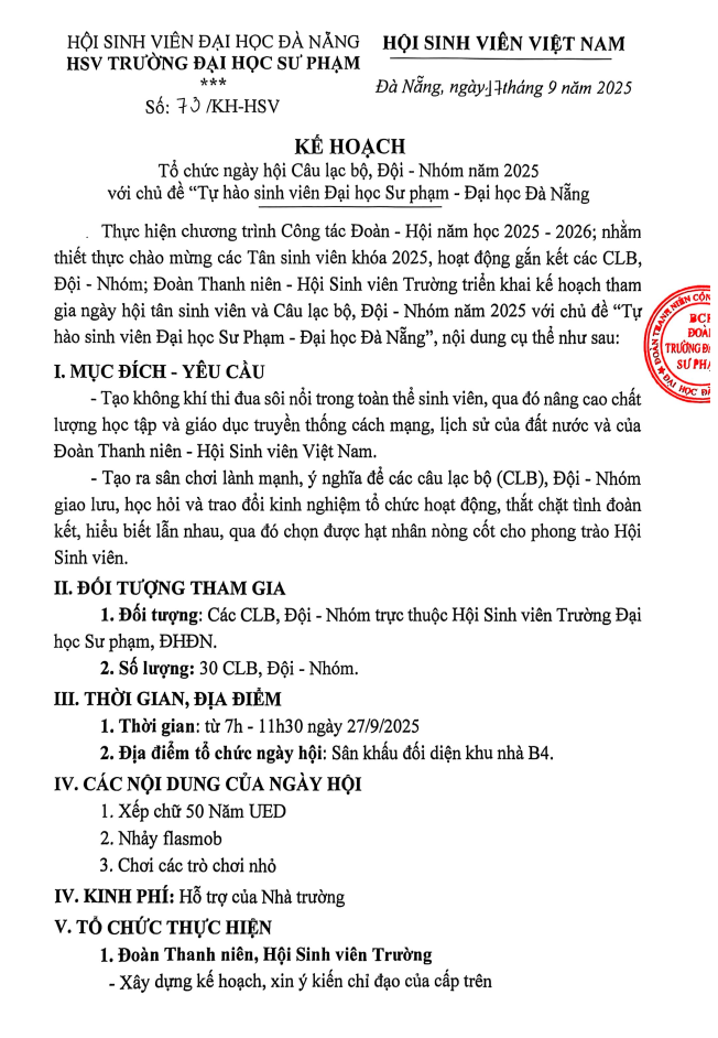 HỘI SINH VIÊN, Kế hoạch[KẾ HOẠCH] Tổ chức ngày hội Câu lạc bộ, Đội – Nhóm năm 2025 với chủ đề “Tự hào sinh viên Đại học Sư phạm – Đại học Đà Nẵng” Đã đăng trên 30 Tháng 10, 2025 bởi uedbandoanvu Văn bản đầy đủ: TẠI ĐÂY uedbandoanvu [KẾ HOẠCH] Tổ chức tập huấn công tác truyền thông cho cán bộ Đoàn – Hội, đoàn viên sinh viên trường Đại học Sư phạm – ĐHĐN năm 2024 [TỜ TRÌNH] Vv xin cấp bảng điểm phục vụ công tác xét chọn “Sinh viên 5 tốt” cấp ĐHĐN, TP năm học 2024 – 2025