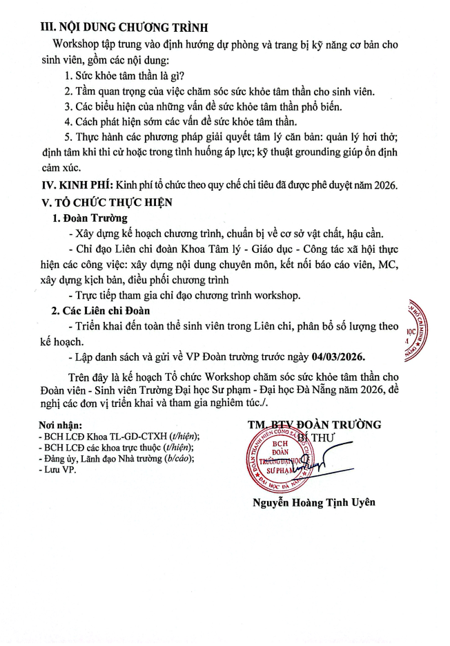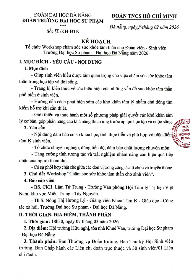 Đoàn Thanh niên, ĐOÀN THANH NIÊN[KẾ HOẠCH] Tổ chức Workshop chăm sóc sức khỏe tâm thần cho Đoàn viên – Sinh viên Trường Đại học Sư phạm – Đại học Đà Nẵng năm 2026 Đã đăng trên 21 Tháng 4, 202621 Tháng 4, 2026 bởi uedbandoanvu Văn bản đầy đủ: TẠI ĐÂY uedbandoanvu Quy định về quy cách cờ Đảng [THÔNG BÁO] Vv triệu tập sinh viên tham dự cổ vũ Cuộc thi Tài năng nghệ thuật thành phố Đà Nẵng – Xuân Bính Ngọ 2026
