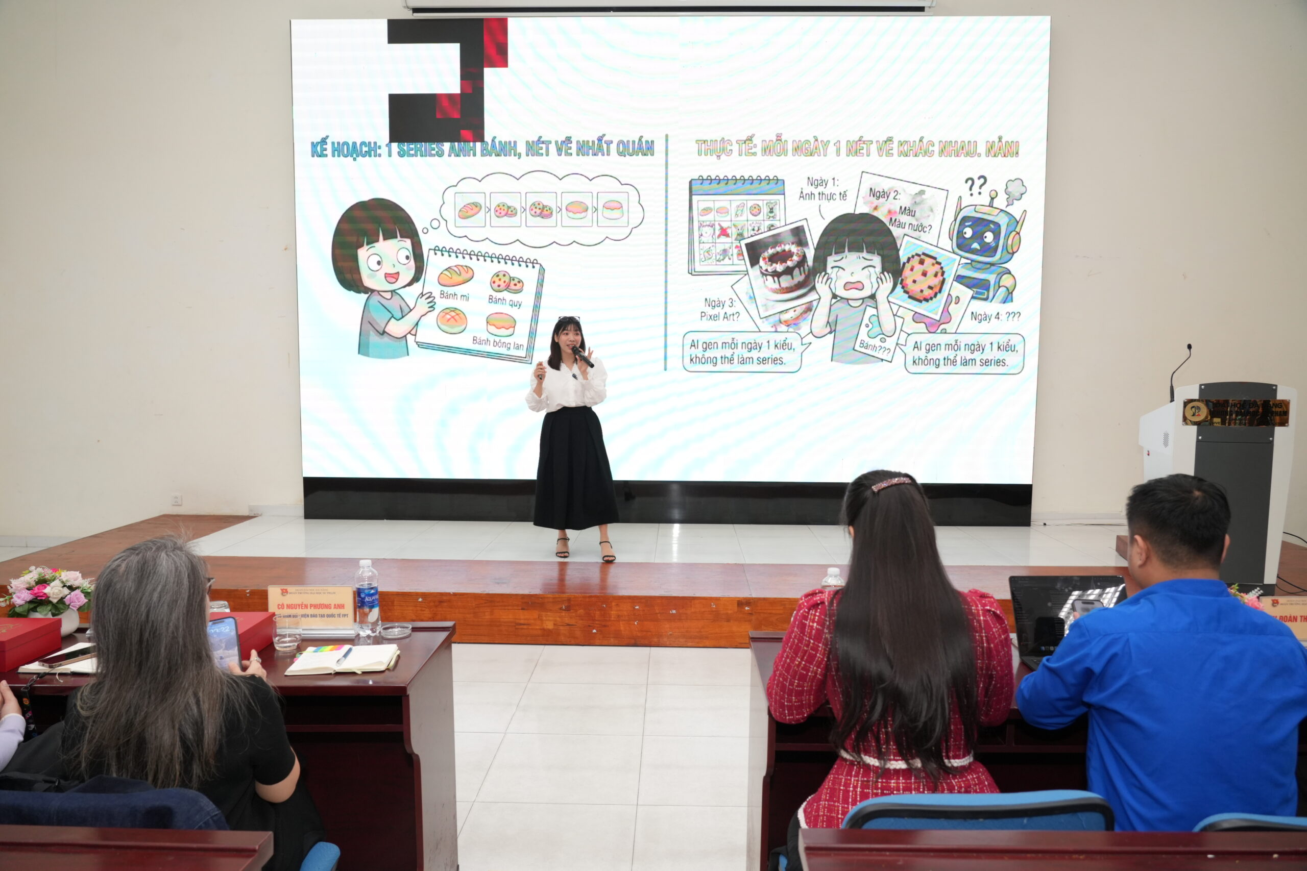Khác với các buổi tập huấn nặng về lý thuyết, lớp học mini “Kỹ năng số 4.0” hướng đến việc cung cấp góc nhìn thực tế, dễ hiểu thông qua những chia sẻ thiết thực và gần gũi của diễn giả Đỗ Thanh Hiền. Với hơn 10 năm kinh nghiệm trong lĩnh vực Marketing, diễn giả đã phân tích cách AI đang được ứng dụng trong sáng tạo nội dung và truyền thông hiện nay, đồng thời gợi mở những hướng đi phù hợp để các bạn đoàn viên, thanh niên và sinh viên có thể ứng dụng AI phù hợp với thực tiễn môi trường học đường và các hoạt động Đoàn – Hội.
