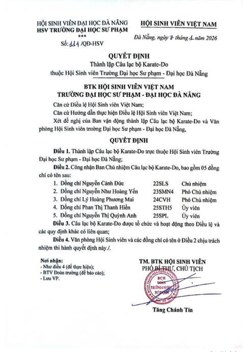 HỘI SINH VIÊN, Quyết định{QUYẾT ĐỊNH} Thành lập Câu lạc bộ Karate-Do thuộc Hội sinh viên Trường Đại học Sư phạm – Đại học Đà Nẵng Đã đăng trên 30 Tháng 4, 2026 bởi uedbandoanvu Văn bản đầy đủ : TẠI ĐÂY uedbandoanvu {QUYẾT ĐỊNH} Thành lập Câu lạc bộ Khoa học Tự nhiên thuộc Hội Sinh viên Trường Đại học Sư phạm – Đại học Đà Nẵng