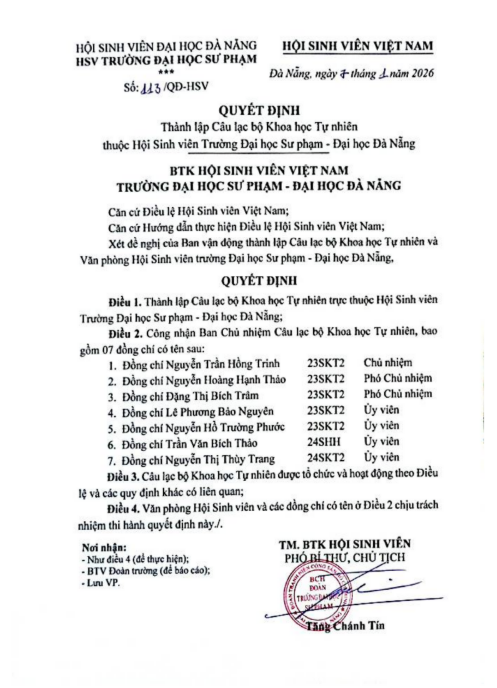 Quyết định{QUYẾT ĐỊNH} Thành lập Câu lạc bộ Khoa học Tự nhiên thuộc Hội Sinh viên Trường Đại học Sư phạm – Đại học Đà Nẵng Đã đăng trên 30 Tháng 4, 2026 bởi uedbandoanvu Văn bản đầy đủ : TẠI ĐÂY uedbandoanvu {QUYẾT ĐỊNH} Vv công nhận các cá nhân có thành tích xuất sắc Chương trình tình nguyện Đông “Một hành trình yêu thương” năm 2025 {QUYẾT ĐỊNH} Thành lập Câu lạc bộ Karate-Do thuộc Hội sinh viên Trường Đại học Sư phạm – Đại học Đà Nẵng
