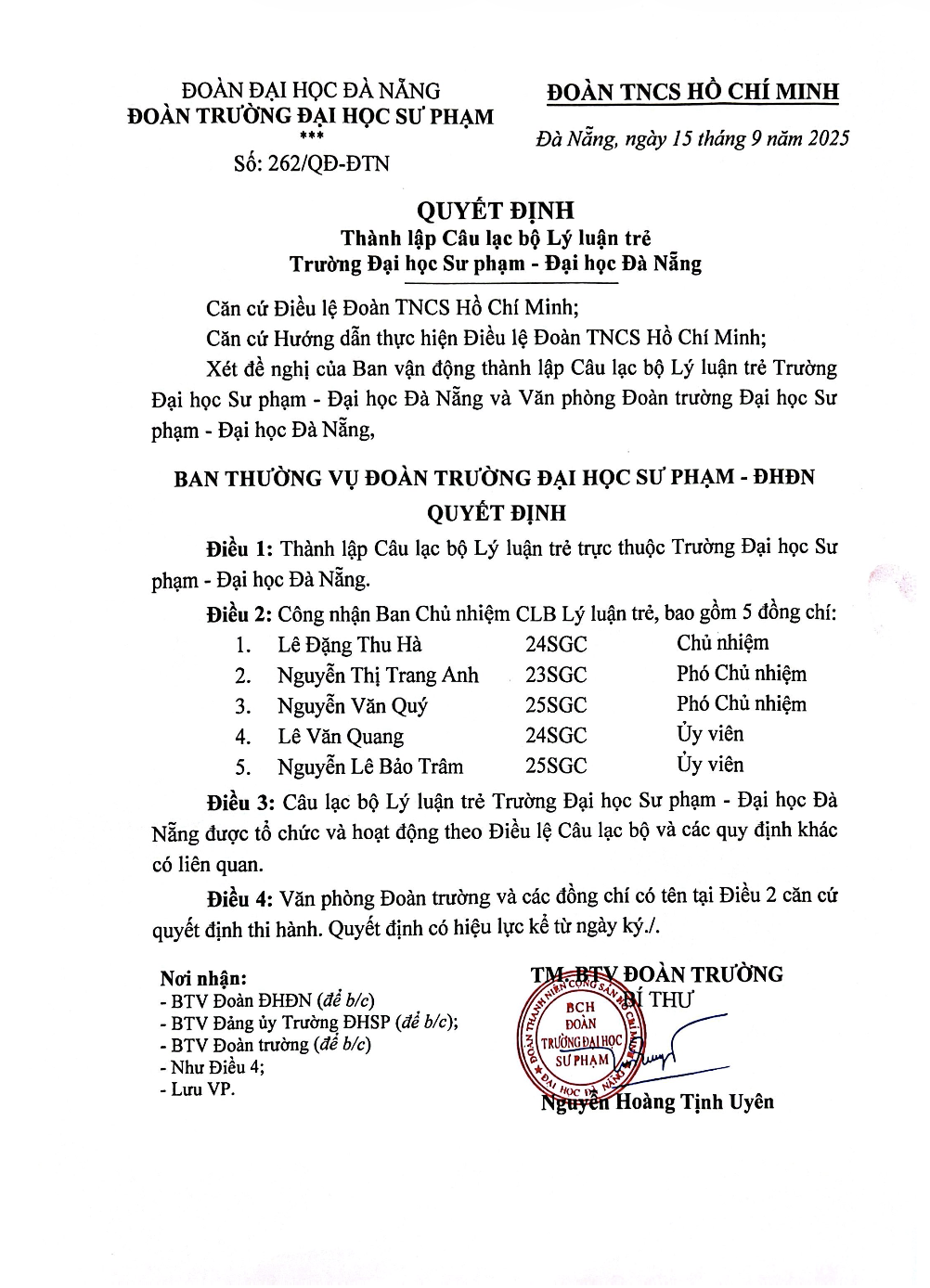 Đoàn Thanh niên, ĐOÀN THANH NIÊN, HỆ THỐNG VĂN BẢN, Quyết định[QUYẾT ĐỊNH] Thành lập Câu lạc bộ Lý luận trẻ Trường Đại học Sư phạm – Đại học Đà Nẵng Đã đăng trên 21 Tháng 1, 2026 bởi uedbandoanvu Văn bản đầy đủ: TẠI ĐÂY uedbandoanvu [QUYẾT ĐỊNH] Vv công nhận các cá nhân là tình nguyện viên hỗ trợ Chương trình khai mạc Ngày hội Sách 2025 [QUYẾT ĐỊNH] Vv công nhận các cá nhân tham dự Chương trình họp báo giới thiệu Cuộc thi “Hoa hậu Sinh viên Hòa bình Việt Nam 2025”