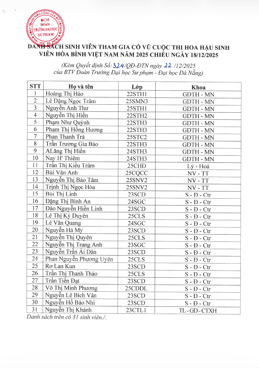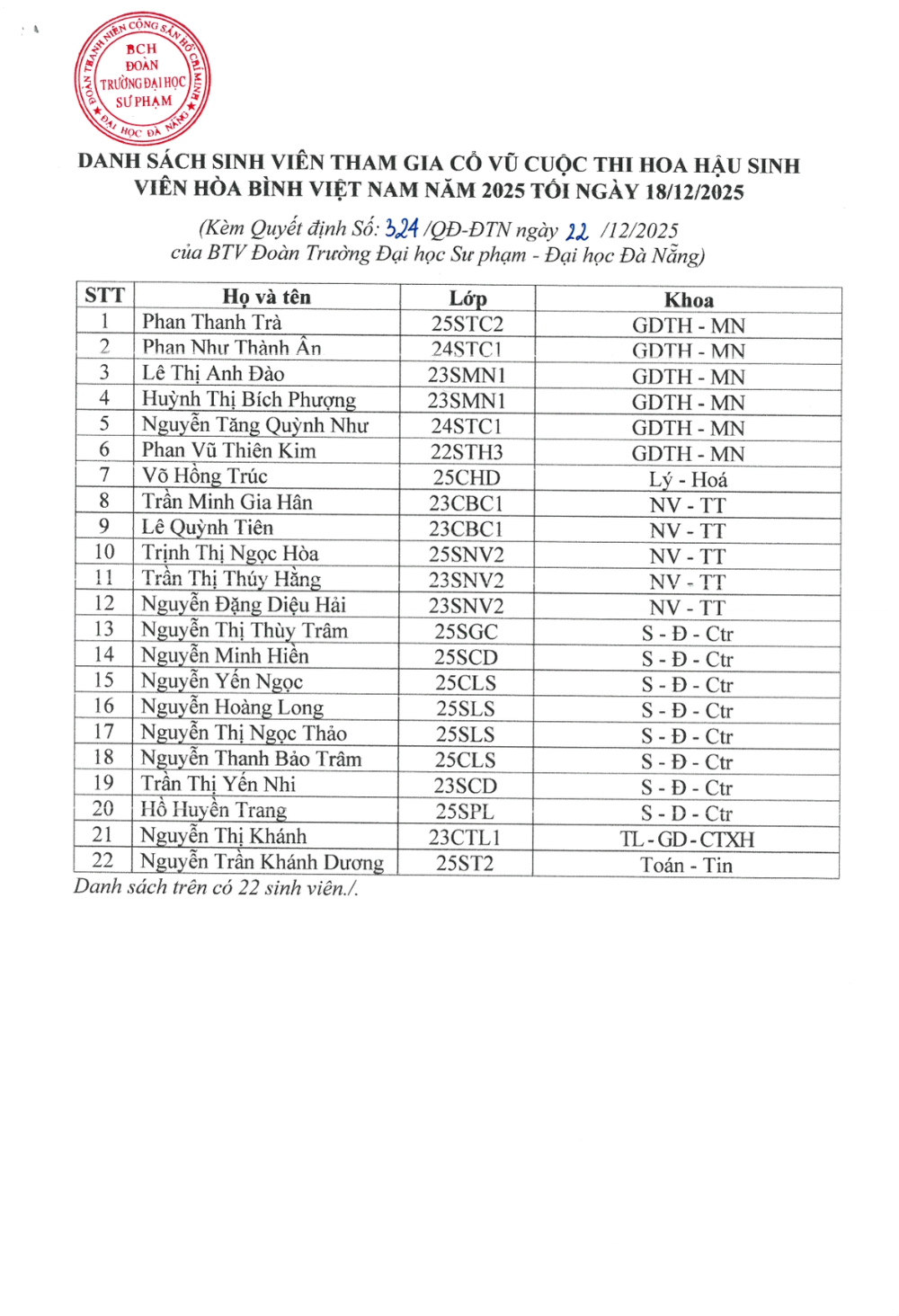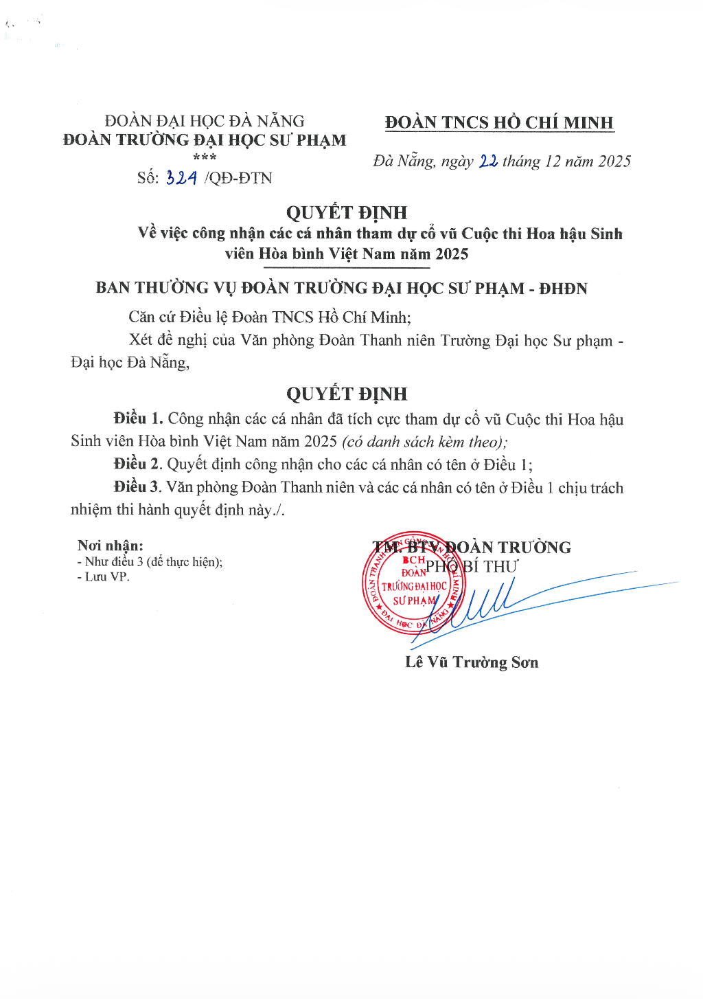 [QUYẾT ĐỊNH] Vv công nhận các cá nhân tham dự cổ vũ Cuộc thi Hoa hậu Sinh viên Hòa bình Việt Nam năm 2025