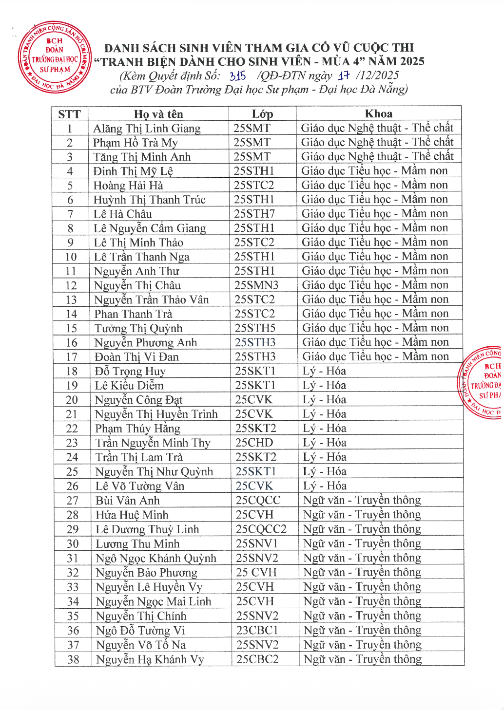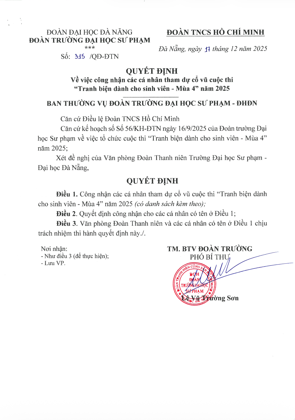 [QUYẾT ĐỊNH] Vv công nhận các cá nhân tham dự cỗ vũ cuộc thi “Tranh biện dành cho sinh viên – Mùa 4” năm 2025
