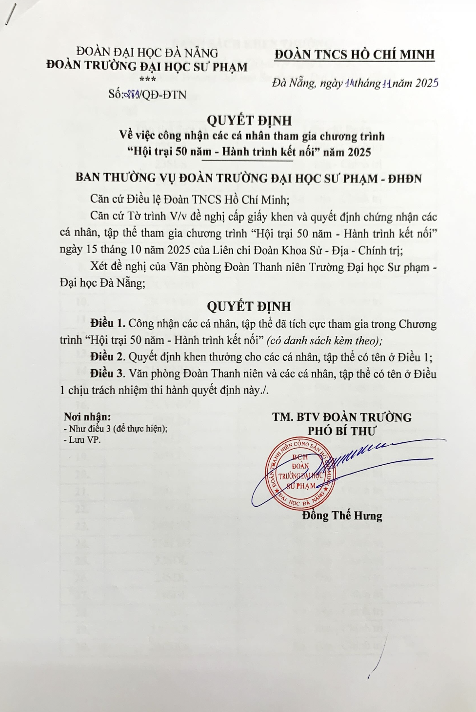 [QUYẾT ĐỊNH] Vv công nhận các cá nhân tham gia chương trình “Hội trại 50 năm – Hành trình kết nối” năm 2025