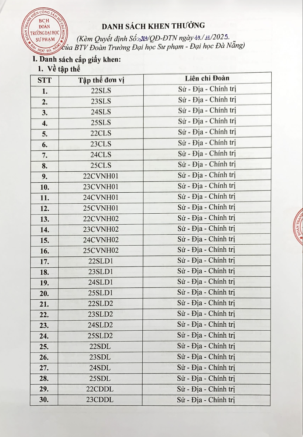• [QUYẾT ĐỊNH] Vv khen thưởng các tập thể có thành tích xuất sắc trong Công tác Đoàn và phong trào thanh niên năm học 2024 – 2025