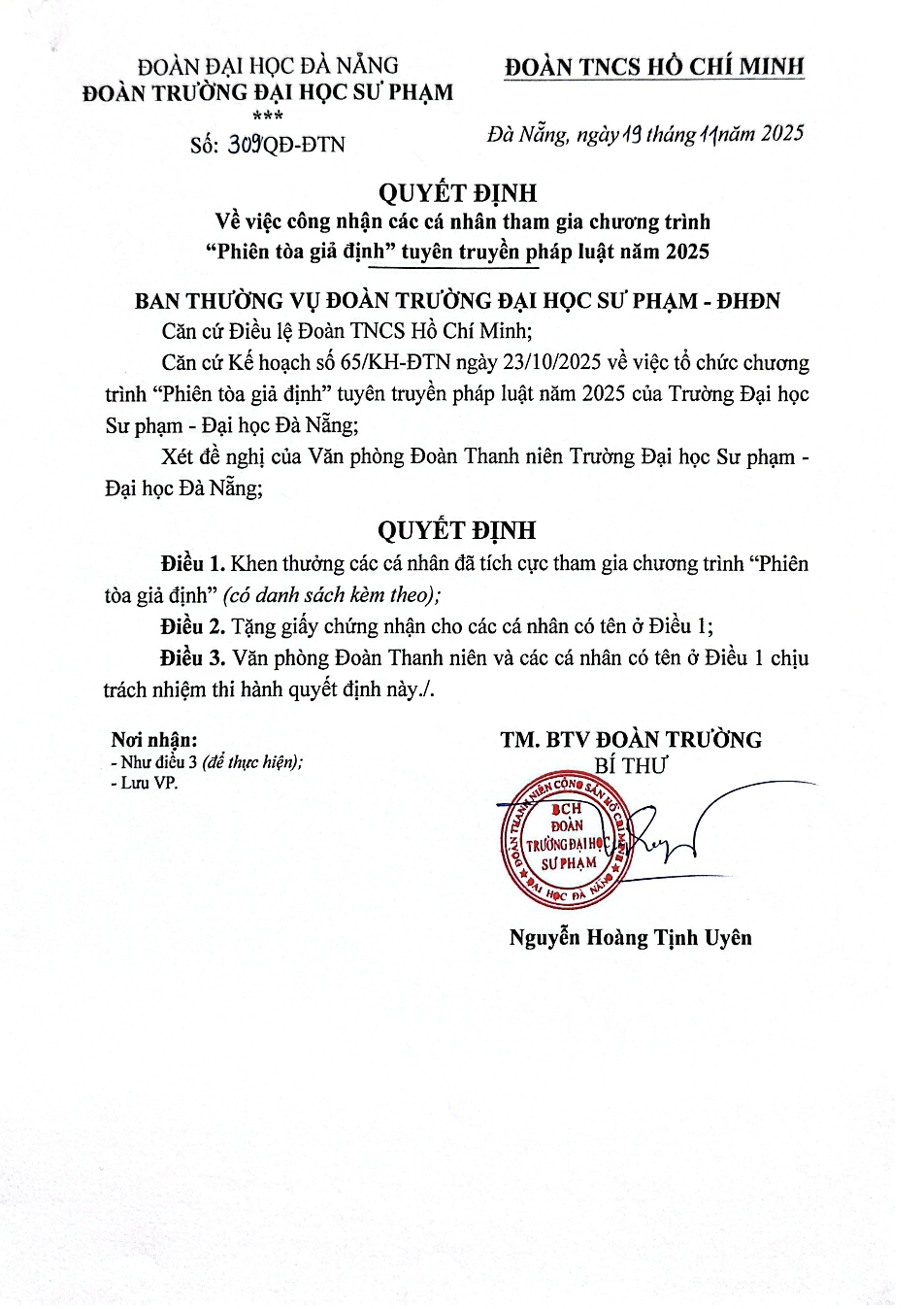 Đoàn Thanh niên, ĐOÀN THANH NIÊN, HỆ THỐNG VĂN BẢN, Quyết định[QUYẾT ĐỊNH] Vv công nhận các cá nhân tham gia chương trình “Phiên tòa giả định” tuyên truyền pháp luật năm 2025 Đã đăng trên 21 Tháng 1, 2026 bởi uedbandoanvu Văn bản đầy đủ: TẠI ĐÂY uedbandoanvu [QUYẾT ĐỊNH] Vv công nhận các cá nhân là tình nguyện viên hỗ trợ Chương trình Nghệ thuật Khai khóa 2025 [QUYẾT ĐỊNH] Vv chứng nhận các cá nhân đã tham gia chương trình Văn nghệ Chào đón năm mới 2026