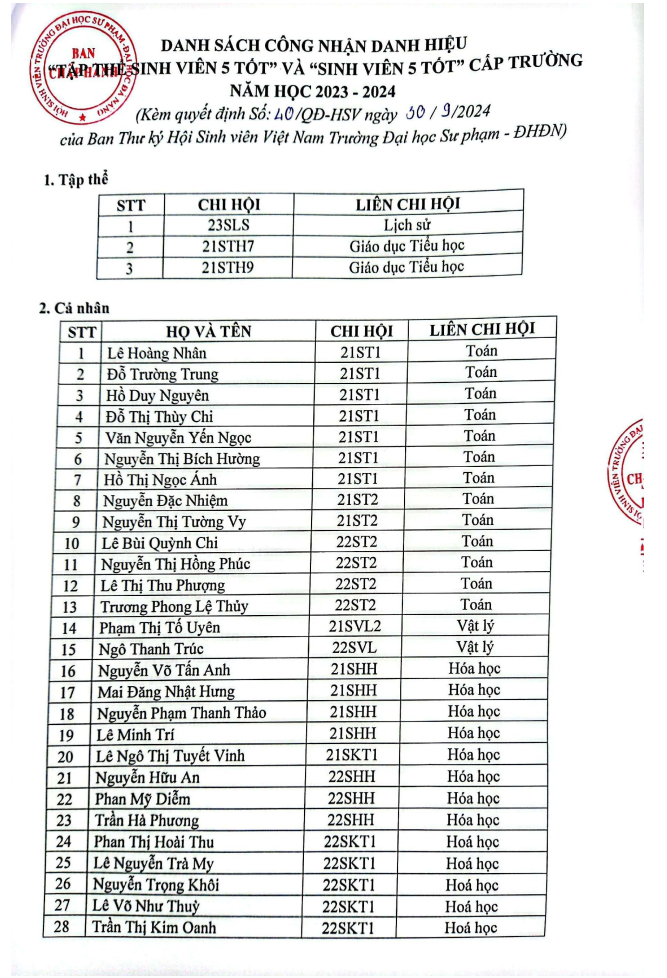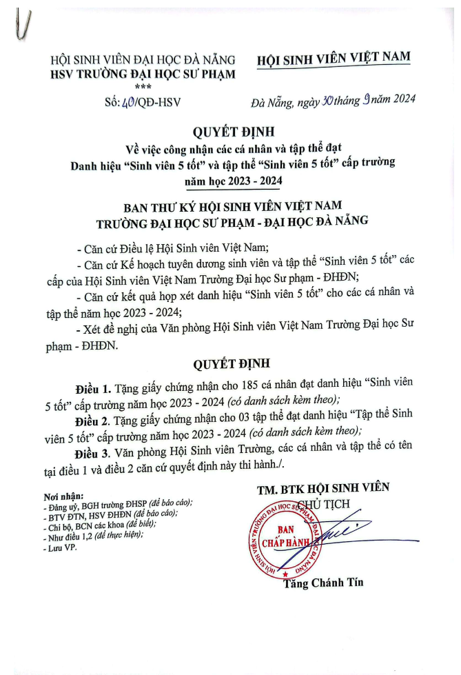Quyết định, HỘI SINH VIÊN, Sinh viên 5 tốt[QUYẾT ĐỊNH] Vv công nhận các cá nhân và tập thể đạt Danh hiệu “Sinh viên 5 tốt” và tập thể “Sinh viên 5 tốt” cấp Trường năm học 2023 – 2024 Đã đăng trên 29 Tháng 10, 2025 bởi uedbandoanvu Văn bản đầy đủ: TẠI ĐÂY uedbandoanvu [QUYẾT ĐỊNH] Vv công nhận các cá nhân có thành tích xuất sắc trong hoạt động Gia sư cho em tại Trường Hy vọng “Hope School” [QUYẾT ĐỊNH] Công nhận cá nhân tham gia cuộc thi sáng tác Văn học và Báo chí chủ đề “Vệt phấn tương lai” – Chào mừng ngày 20/11