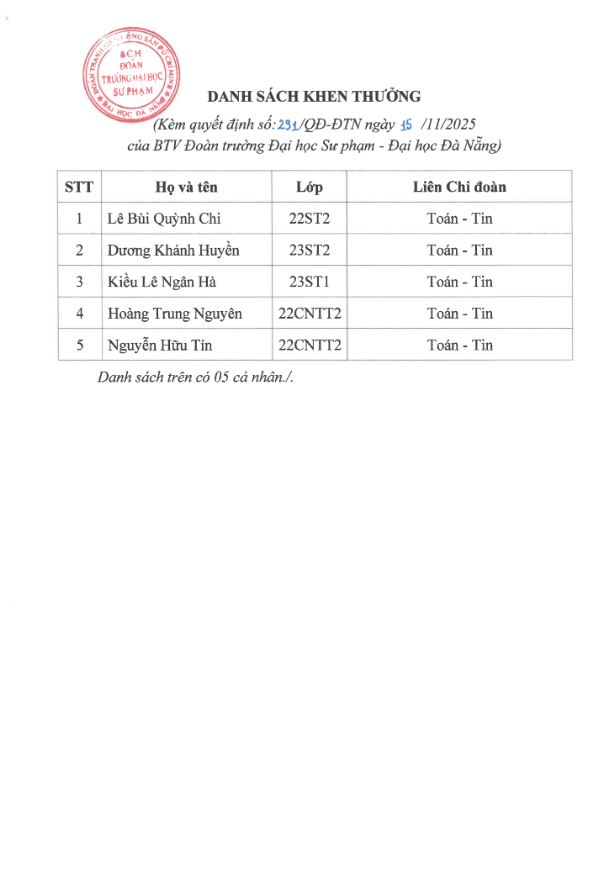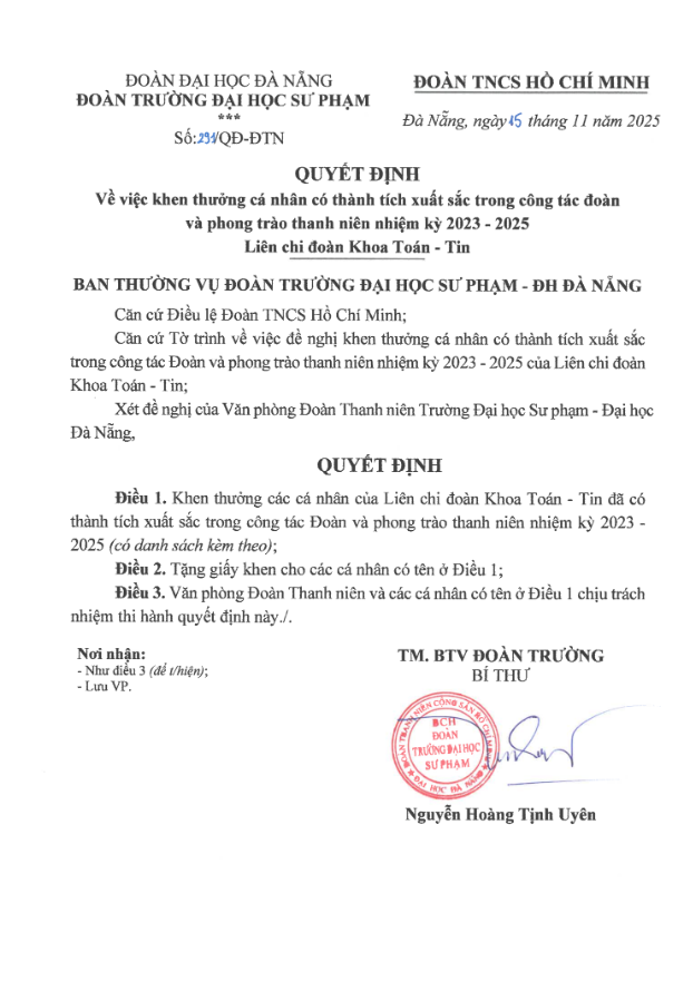 [QUYẾT ĐỊNH] Vv khen thưởng cá nhân có thành tích xuất sắc trong công tác đoàn và phong trào thanh niên nhiệm kỳ 2023 – 2025 Liên chi đoàn Khoa Toán – Tin