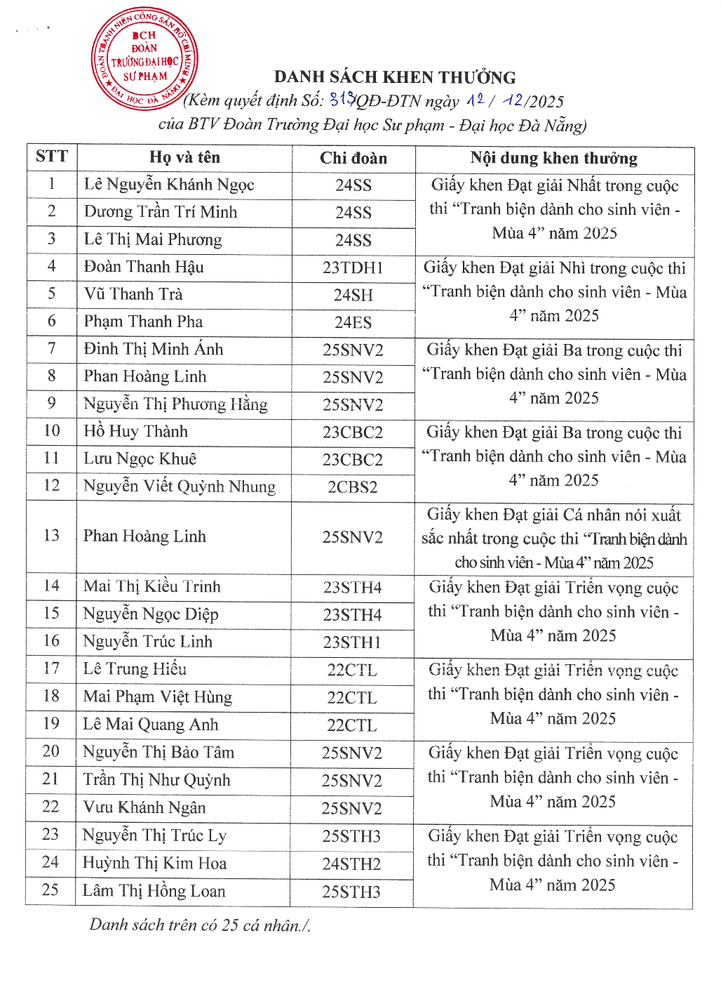 [QUYẾT ĐỊNH] Vv khen thưởng các cá nhân có thành tích xuất sắc trong cuộc thi “Tranh biện dành cho sinh viên – Mùa 4” năm 2025
