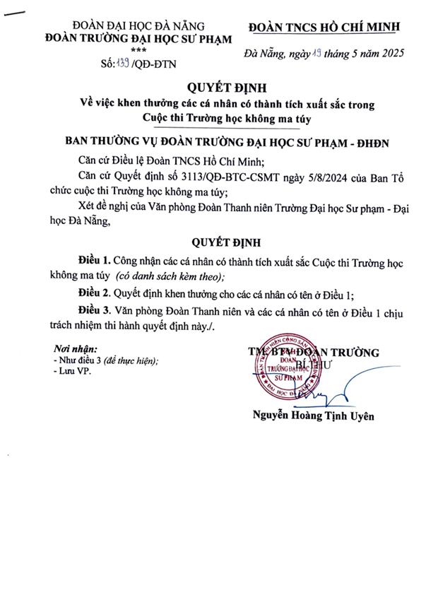 [QUYẾT ĐỊNH] Vv khen thưởng các cá nhân có thành tích xuất sắc trong Cuộc thi Trường học không ma túy