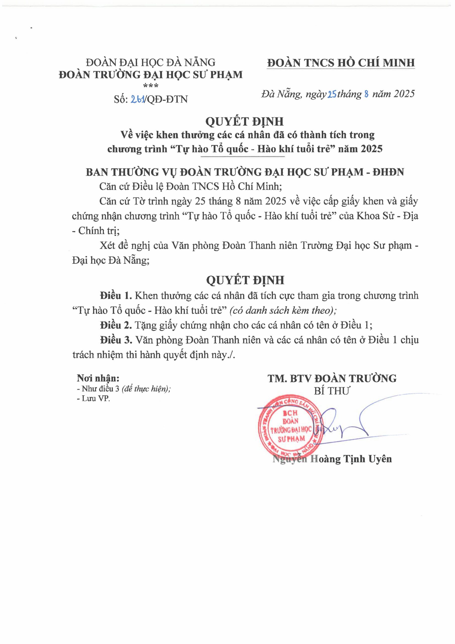 Đoàn Thanh niên, ĐOÀN THANH NIÊN, HỆ THỐNG VĂN BẢN, Quyết định[QUYẾT ĐỊNH] Vv khen thưởng các cá nhân đã có thành tích trong chương trình “Tự hào Tổ quốc – Hào khí tuổi trẻ” năm 2025 Đã đăng trên 23 Tháng 1, 2026 bởi uedbandoanvu Văn bản đầy đủ: TẠI ĐÂY uedbandoanvu [QUYẾT ĐỊNH] Vv công nhận các cá nhân đã tham gia Chương trình “Tập huấn phổ biến kiến thức, kỹ năng phòng tránh lừa đảo trên không gian mạng trong bối cảnh hội nhập quốc tế” [QUYẾT ĐỊNH] Vv khen thưởng các cá nhân có thành tích xuất sắc trong hoạt động công tác Đoàn và phong trào thanh niên năm học 2024 – 2025