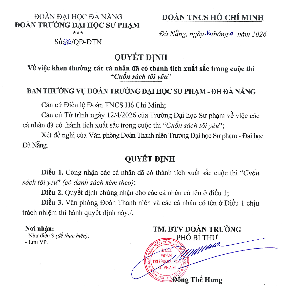 HỆ THỐNG VĂN BẢN, ĐOÀN THANH NIÊN, Quyết định[QUYẾT ĐỊNH] Vv khen thưởng các cá nhân đã có thành tích xuất sắc trong cuộc thi “Cuốn sách tôi yêu” Đã đăng trên 20 Tháng 4, 2026 bởi uedbandoanvu Văn bản đầy đủ: TẠI ĐÂY uedbandoanvu [QUYẾT ĐỊNH] Vv công nhận các cá nhân đã tham gia chương trình Chương trình Ideas 4 Life 2026 – Chủ đề “Giải pháp sáng tạo thời đại chuyển đổi số” [QUYẾT ĐỊNH] Vv khen thưởng các cá nhân có đóng góp tích cực trong Hội trại “Tuổi trẻ xung kích” Khoa Tâm lý – Giáo dục – Công tác xã hội năm 2026