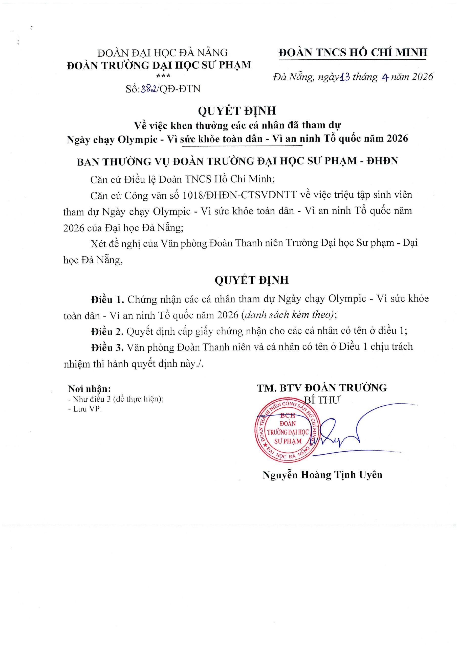 HỆ THỐNG VĂN BẢN, ĐOÀN THANH NIÊN, Quyết định[QUYẾT ĐỊNH] Vv khen thưởng các cá nhân đã tham dự Ngày chạy Olympic – Vì sức khỏe toàn dân – Vì an ninh Tổ quốc năm 2026 Đã đăng trên 29 Tháng 4, 2026 bởi uedbandoanvu Văn bản đầy đủ: TẠI ĐÂY uedbandoanvu [QUYẾT ĐỊNH] Vv khen thưởng các cá nhân đã tham gia hỗ trợ chương trình Bán kết cuộc thi Tài năng nghệ thuật năm 2026 [QUYẾT ĐỊNH] Vv khen thưởng các cá nhân tham gia chương trình “San sẻ yêu thương năm 2026”