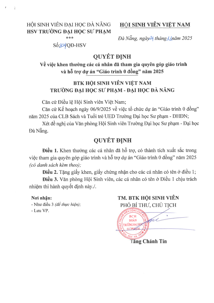 [QUYẾT ĐỊNH] Vv khen thưởng các cá nhân đã tham gia quyên góc giáo trình và hỗ trợ dự án “Giáo trình 0 đồng” năm 2025