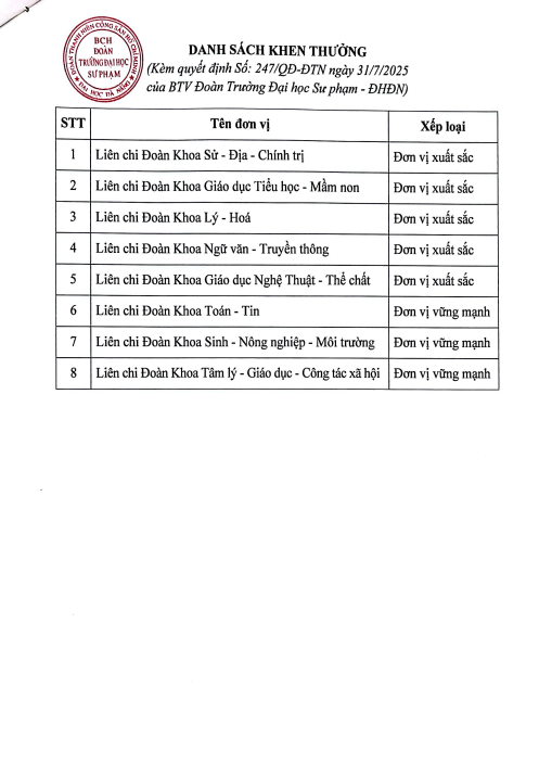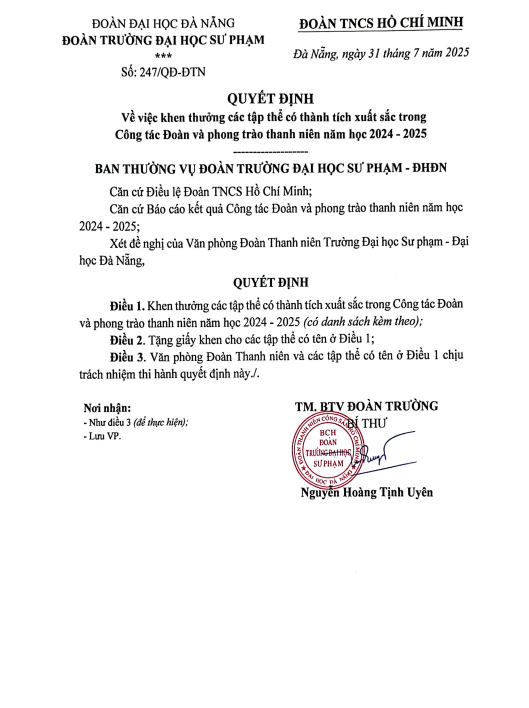 HỆ THỐNG VĂN BẢN, ĐOÀN THANH NIÊN, Đoàn Thanh niên, Quyết định[QUYẾT ĐỊNH] Vv khen thưởng các tập thể có thành tích xuất sắc trong Công tác Đoàn và phong trào thanh niên năm học 2024 – 2025 Đã đăng trên 23 Tháng 1, 2026 bởi uedbandoanvu Văn bản đầy đủ: TẠI ĐÂY uedbandoanvu [QUYẾT ĐỊNH] Vv khen thưởng các cá nhân có thành tích xuất sắc trong Chương trình Liên hoan tài năng sinh viên Đại học Đà Nẵng lần thứ II, năm 2025 với chủ đề “Sắc màu tuổi trẻ – The colors of youth” [QUYẾT ĐỊNH] Vv chứng nhận các tình nguyện viên tham gia hỗ trợ Ngày hội Văn hóa đọc năm 2025