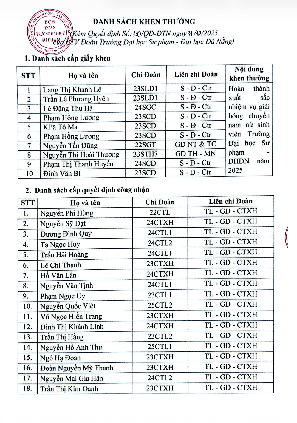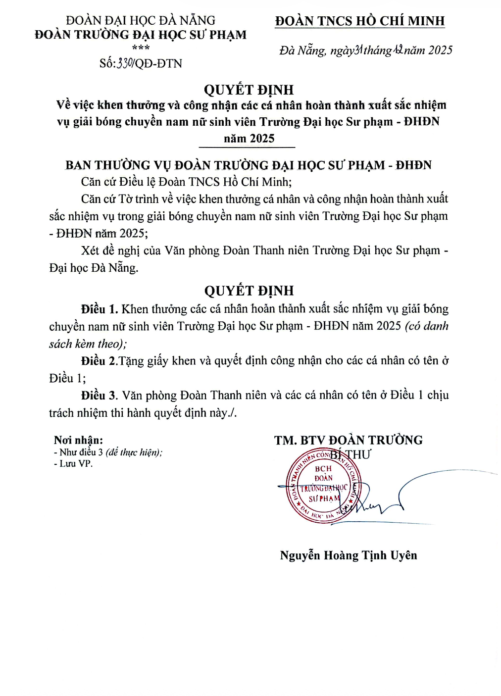 Đoàn Thanh niên, ĐOÀN THANH NIÊN, HỆ THỐNG VĂN BẢN, Quyết định[QUYẾT ĐỊNH] Vv khen thưởng và công nhận các cá nhân hoàn thành nhiệm xuất sắc nhiệm vụ giải bóng chuyền nam nữ sinh viên Trường Đại học Sư phạm – Đại học Đà Nẵng năm 2025 Đã đăng trên 21 Tháng 1, 2026 bởi uedbandoanvu Văn bản đầy đủ: TẠI ĐÂY uedbandoanvu [QUYẾT ĐỊNH] Vv công nhận các cá nhân tham dự cổ vũ Cuộc thi Hoa hậu Sinh viên Hòa bình Việt Nam năm 2025 [QUYẾT ĐỊNH] Vv công nhận các cá nhân tham gia chương trình tập huấn phân loại rác tại biển Nguyễn Tất Thành