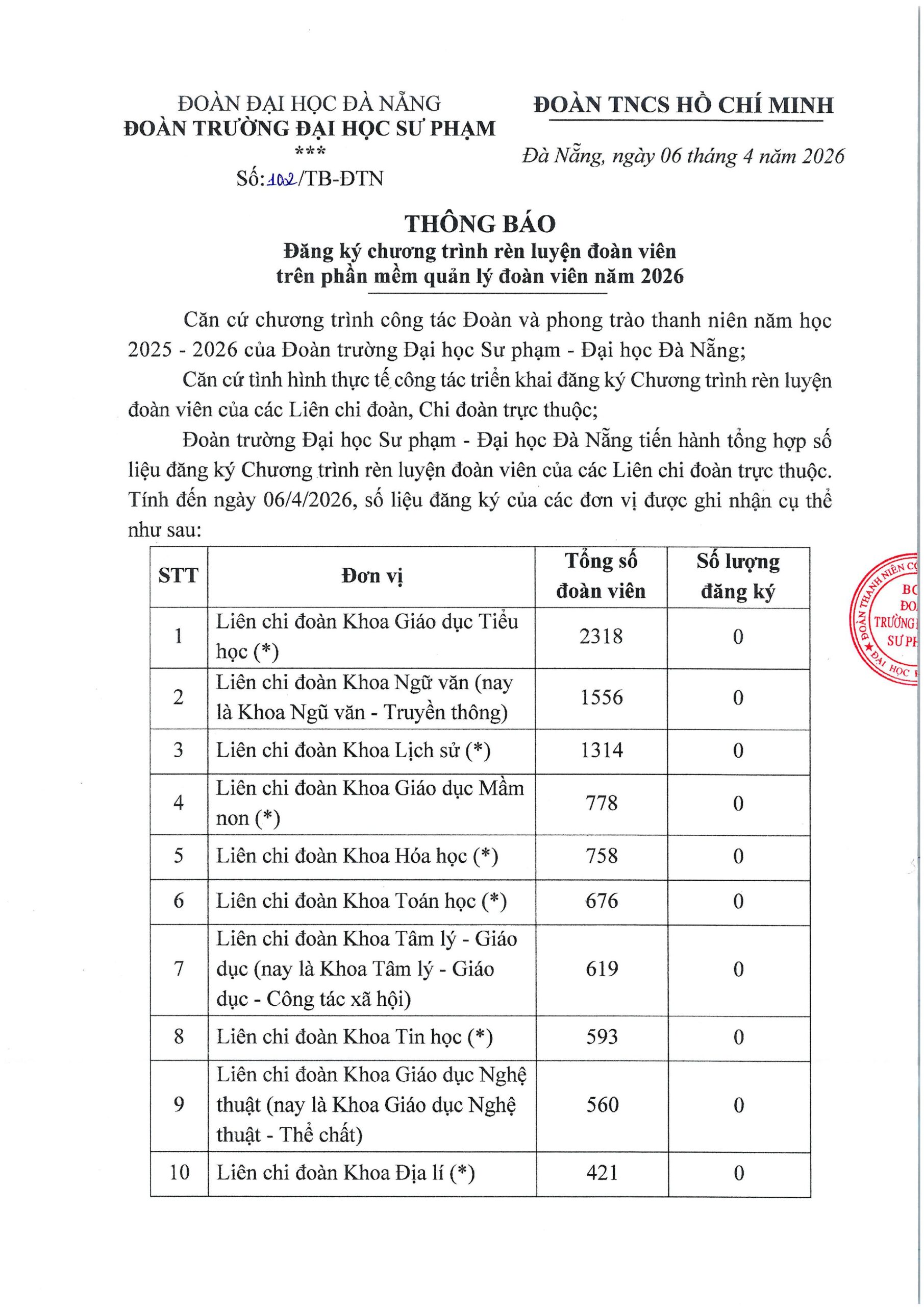 NEWS, THÔNG BÁO[THÔNG BÁO] Đăng ký chương trình rèn luyện đoàn viên trên phần mềm Quản lý đoàn viên năm 2026 Đã đăng trên 28 Tháng 4, 2026 bởi uedbandoanvu Văn bản đầy đủ: TẠI ĐÂY uedbandoanvu [KẾ HOẠCH] Tổ chức tập huấn nâng cao kỹ năng số cho cán bộ Đoàn – Hội, đoàn viên sinh viên Trường Đại học Sư phạm – Đại học Đà Nẵng năm 2026, Lớp học mini “Bạn là Ai trong kỷ nguyên AI?” [THÔNG BÁO] Về việc triệu tập sinh viên tham dự giao lưu với tác giả tiểu thuyết “Lớp học cuối cùng” – Hoàng Anh Đức và trao đổi chủ đề: Chủ thể người học, quyền lực tri thức và những câu hỏi thời đại AI