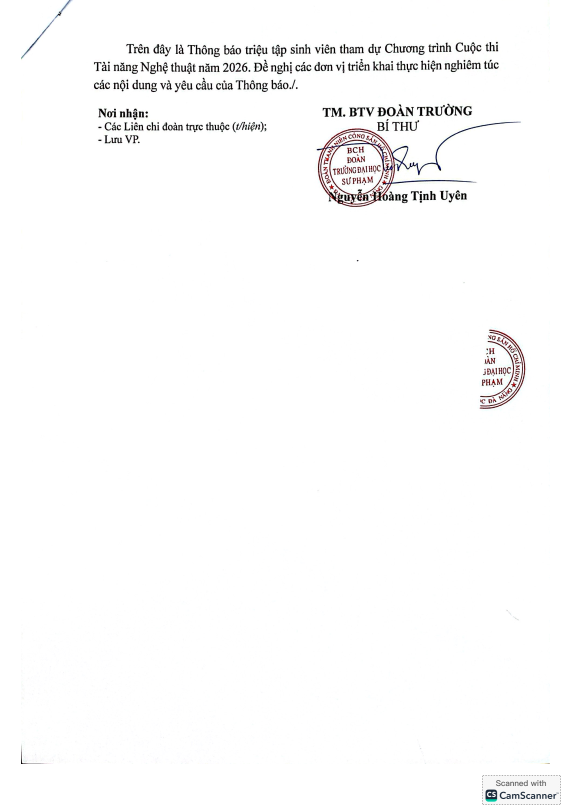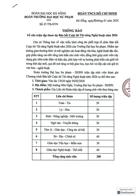 HỆ THỐNG VĂN BẢN, ĐOÀN THANH NIÊN, NEWS, THÔNG BÁO[THÔNG BÁO] Về việc triệu tập tham dự Bán kết Cuộc thi Tài năng Nghệ thuật năm 2026 Đã đăng trên 29 Tháng 1, 2026 bởi uedbandoanvu Văn bản đầy đủ: TẠI ĐÂY uedbandoanvu [QUYẾT ĐỊNH] Vv công nhận các cá nhân tham gia hỗ trợ chương trình Lễ kỷ niệm 50 năm Kết nối và Phát triển Trường Đại học Sư phạm – Đại học Đà Nẵng [THÔNG BÁO] Vv triệu tập sinh viên tham dự Lễ phát động Cuộc thi Sinh viên khởi nghiệp UED 2026 với Chủ đề: “Ươm mầm sáng tạo – Định hình doanh nghiệp”