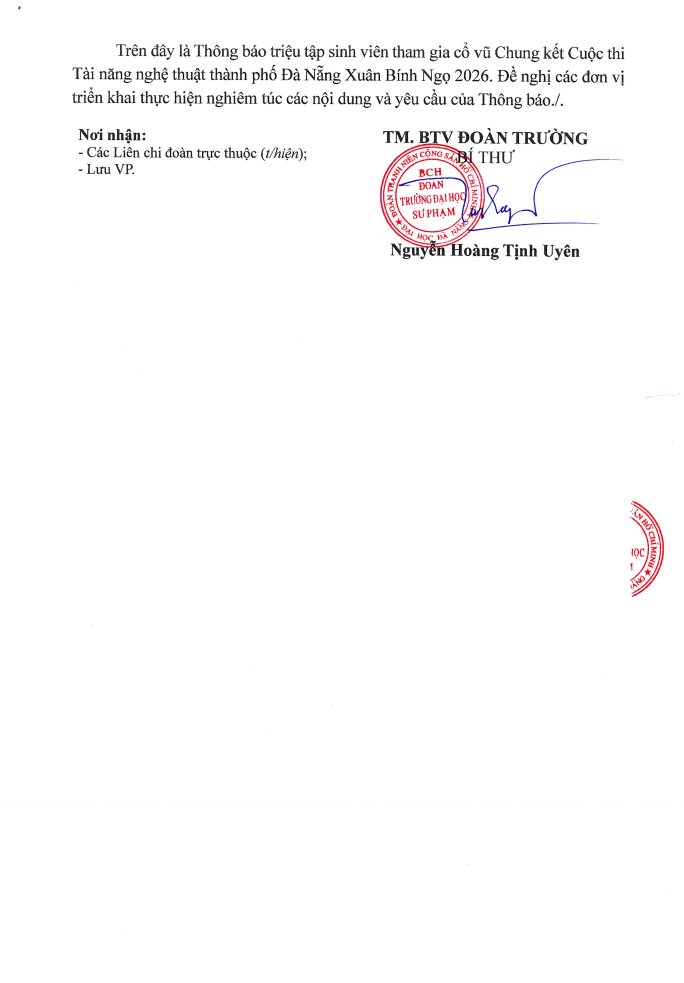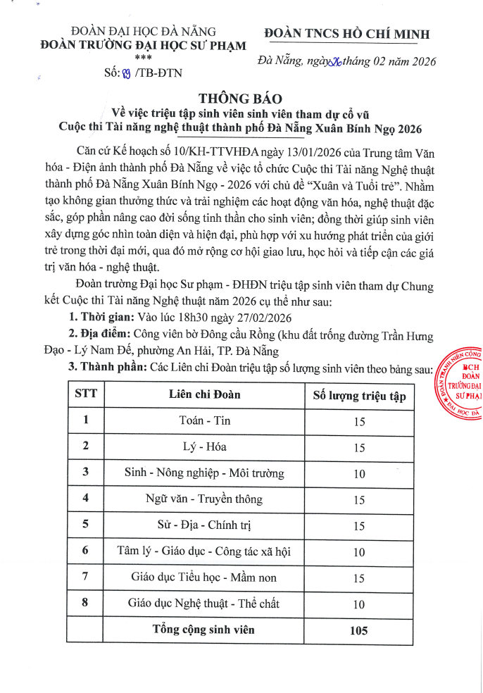 Đoàn Thanh niên, NEWS, THÔNG BÁO[THÔNG BÁO] Vv triệu tập sinh viên tham dự cổ vũ Cuộc thi Tài năng nghệ thuật thành phố Đà Nẵng – Xuân Bính Ngọ 2026 Đã đăng trên 21 Tháng 4, 2026 bởi uedbandoanvu Văn bản đầy đủ: TẠI ĐÂY uedbandoanvu [KẾ HOẠCH] Tổ chức Workshop chăm sóc sức khỏe tâm thần cho Đoàn viên – Sinh viên Trường Đại học Sư phạm – Đại học Đà Nẵng năm 2026 [KẾ HOẠCH] Tổ chức Chương trình Ideas 4 Life 2026 – Chủ đề “Giải pháp sáng tạo thời đại chuyển đổi số”