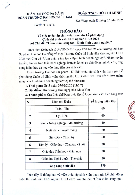 HỆ THỐNG VĂN BẢN, ĐOÀN THANH NIÊN, NEWS, THÔNG BÁO[THÔNG BÁO] Vv triệu tập sinh viên tham dự Lễ phát động Cuộc thi Sinh viên khởi nghiệp UED 2026 với Chủ đề: “Ươm mầm sáng tạo – Định hình doanh nghiệp” Đã đăng trên 29 Tháng 1, 2026 bởi uedbandoanvu Văn bản đầy đủ: TẠI ĐÂY uedbandoanvu [THÔNG BÁO] Về việc triệu tập tham dự Bán kết Cuộc thi Tài năng Nghệ thuật năm 2026 [QUYẾT ĐỊNH] Vv khen thưởng cá nhân đã có thành tích xuất sắc trong các hoạt động của Đội Công tác xã hội nhiệm kỳ 2024 – 2025
