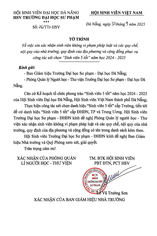 Sinh viên 5 tốt, HỘI SINH VIÊN[TỜ TRÌNH] Vv xin xác nhận sinh viên không vi phạm pháp luật và các quy chế, nội quy của nhà trường, quy định của địa phương và cộng đồng phục vụ công tác xét chọn “Sinh viên 5 tốt” năm học 2024 – 2025 Đã đăng trên 30 Tháng 10, 2025 bởi uedbandoanvu Văn bản đầy đủ: TẠI ĐÂY uedbandoanvu [KẾ HOẠCH] Tổ chức chương trình “Hành trình màu áo lính – Tuổi trẻ vì biển đảo quê hương” năm 2024 [KẾ HOẠCH] Tổ chức chương trình “Khám phá Tết Việt – Chia sẻ và kết nối” lần thứ I Mừng xuân Ất Tỵ 2025